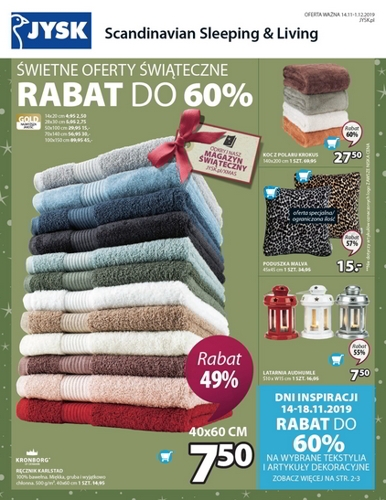 Nowa gazetka promocyjna JYSK - "Świąteczne oferty". Polecane promocje z gazetki Jysk: Rabat 30-60% na wszystkie artykuły świąteczne. Rabat 20-49% na wszystkie dywany. Rabat 20-50% na wszystkie wazony. Oferta ważna od 15.12 do 24.12.