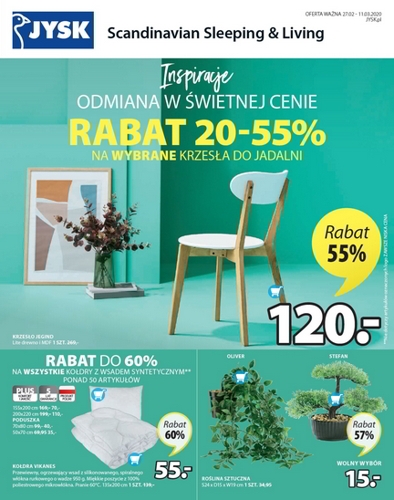 'Odmiana w świetnej cenie' - nowa gazetka promocyjna sieci sklepów JYSK. Polecane promocje z gazetki Jysk: Rabat 20-55% na wybrane krzesła do jadalni. Rabat do 60% na wszystkie kołdry z wsadem syntetycznym. Rabat 20-49% na wszystkie…