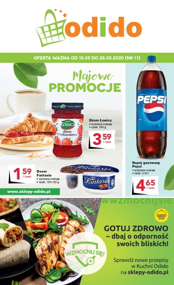 'Majowe promocje' - nowa gazetka promocyjna sklepów Odido. Polecane promocje z gazetki Odido: Dżem Łowicz 280 g - 3,59 zł. Jogurt Danone Fantasia wybrane rodzaje - 1,59 zł. Napój gazowany Pepsi 2,25 L - 4,65 zł. …