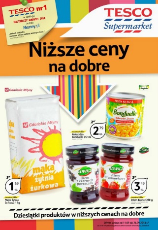 Nowa gazetka promocyjna Tesco - "Niższe ceny na dobre". Polecane promocje z gazetki Tesco: Mąka żytnia żurkowa 1 kg - 1,69 zł. Kukurydza Bonduelle 212 ml - 2,79 zł. Dżem Łowicz 280 g - 3,49 zł. Oferta…