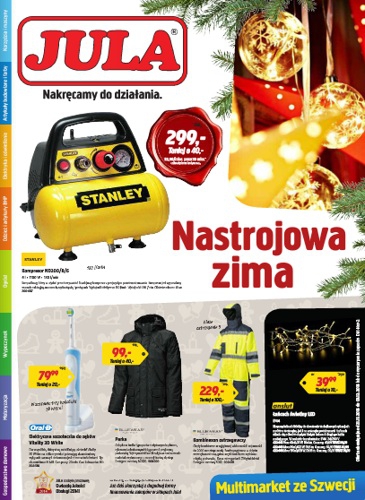 {loadposition linkJula} Nowa gazetka promocyjna sieci handlowej Jula - "Nastrojowa zima". Polecane promocje z gazetki Jula: Kompresor Stanley ND200/8/6 6 l 1100 W 180 l/min - 299 zł. Łańcuch świetlny LED 4 m - 39,99 zł. Elektryczna szczoteczka do…