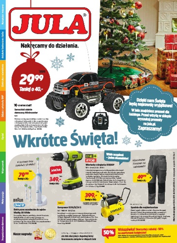 {loadposition linkJula} Nowa gazetka promocyjna sieci handlowej Jula - "Wkrótce Święta!". Polecane promocje z gazetki Jula: Samochód zdalnie sterowany Minimonster - 29,99 zł. Elektryczna szczoteczka do zębów Oral-B Vitality 3D White - 79,99 zł. Spodnie dla majsterkowicza Bluewear -…