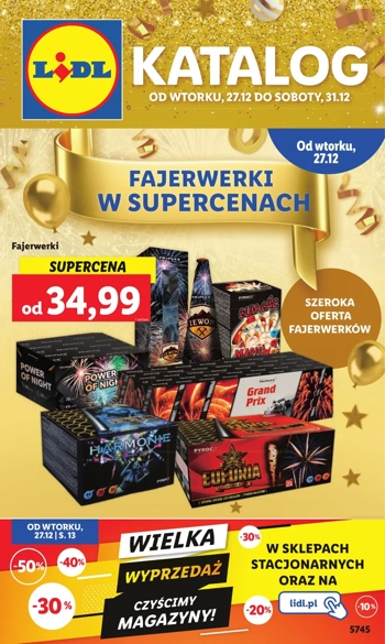{loadposition linkLidl3} 'Sylwestrowy katalog' - nowa gazetka promocyjna sieci sklepów Lidl. Polecane promocje z gazetki sklepów Lidl: Bateria 16-strzałowa Mafia - 25 zł. Bateria 20-strzałowa Mysterie - 59 zł. Bateria 60-strzałowa Power of night - 99 zł. …