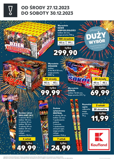 {loadposition linkKaufland4} 'Duży wybór fajerwerków' - nowa gazetka promocyjna sieci marketów Kaufland. Polecane promocje z gazetki Kaufland: Wyrzutnia Dzień Niepodległości 100 strzałów - 299,90 zł. Wyrzutnia Dragon 92 strzały - 99,99 zł. Wyrzutnia Sokół 43 strzały - 69,99 zł.…
