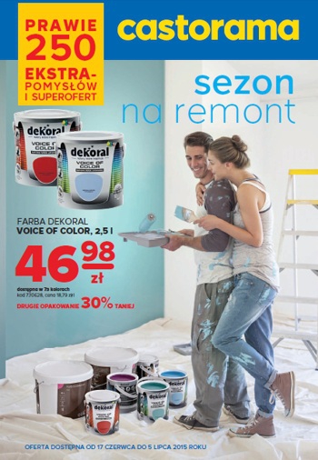 {loadposition linkCastorama} Nowa gazetka promocyjna sieci handlowej Castorama - "Sezon na remont". Polecane promocje z gazetki Castorama: Farba Dekoral Voice of color 2,5 L - 46,98 zł. Farba lateksowa Dulux Home 2,5 L - 42,98 zł. Tapeta do malowania…