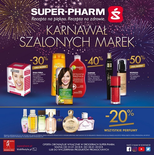 Nowa gazetka promocyjna Super-Pharm - "Karnawał szalonych marek". Polecane promocje z gazetki Super-Pharm: Pasty do zębów i zestawy do wybielania zębów Biała Perła 30% taniej. Kosmetyki do pielęgnacji ciała, włosów oraz koloryzacji włosów Garnier 40% taniej. …