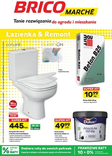 {loadposition linkBricomarche} 'Łazienka & Remont' - nowa gazetka promocyjna sieci sklepów Bricomarche. Polecane promocje z gazetki Bricomarche: Kompakt WC Colour z deską wolnoopadającą - 445 zł. Beton B25 Baumit 25 kg - 10,99 zł. Farba Dulux Absolute White…