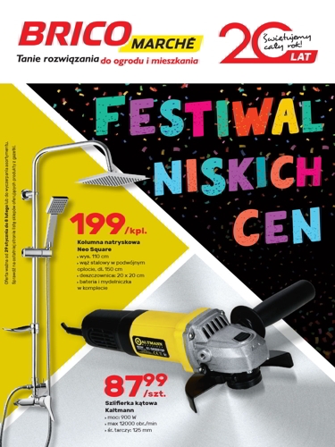 {loadposition linkBricomarche} 'Festiwal niskich cen' - nowa gazetka promocyjna sieci sklepów Bricomarche. Polecane promocje z gazetki Bricomarche: Kolumna natryskowa Neo Square - 199 zł. Szlifierka kątowa Kaltmann 900 W - 87,99 zł. Farba Dulux Absolute White 9 L…
