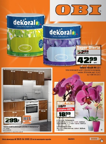 {loadposition linkObi} Nowa gazetka promocyjna Obi. Polecane promocje z gazetki Obi: Farba lateksowa Dekoral Akrylit W 2,5 L - 42,99 zł. Zestaw mebli kuchennych Calvados - 299 zł. Oprawa hermetyczna - 34,99 zł. Oferta ważna od 30.01 do…