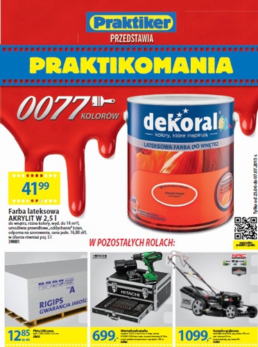 Nowa gazetka promocyjna Praktiker - "Praktikomania". Polecane promocje z gazetki Praktiker: Farba lateksowa Dekoral AKRYLIT W 2,5 L - 41,99 zł. Wiertarkowkrętarka Hitachi - 699 zł. Kosiarka spalinowa NAC - 1099 zł. Oferta ważna od 25.06 do…