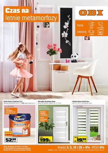 {loadposition linkObi} 'Czas na letnie metamorfozy' - nowa gazetka promocyjna sieci marketów Obi. Polecane promocje z gazetki Obi: Farba lateksowa Dulux EasyCare 2,5 L - 52,98 zł. Skrzydło drzwiowe Apus - 199 zł. Roleta dzień/noc Bravo 35x140 cm -…