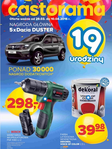 {loadposition linkCastorama} Nowa gazetka promocyjna sieci handlowej Castorama - "19 urodziny". Polecane promocje z gazetki Castorama: Wkrętarka akumulatorowa Bosch PSR 1080 LI-2 - 298 zł. Farba lateksowa wewnętrzna Dekoral Voice of Color 2,5 L - 39,98 zł. Szafka z…