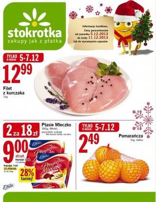 Nowa gazetka promocyjna sieci handlowej Stokrotka. Polecane promocje z gazetki Stokrotka: Filet z kurczaka 1 kg - 12,99 zł. Ptasie mleczko Wedel 2x380 g - 18 zł. Pomarańcze 1 kg - 2,49 zł. Oferta ważna od 5.12…