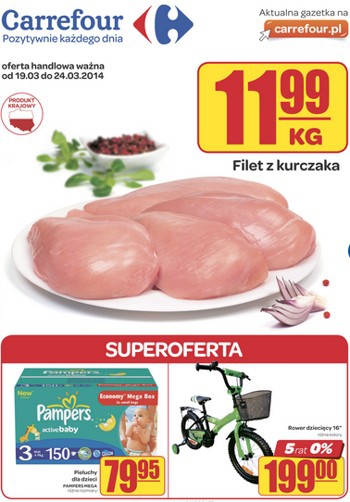 {loadposition linkCarrefour} Nowa gazetka promocyjna sieci handlowej Carrefour. Polecane promocje z gazetki Carrefour: Filet z kurczaka 1 kg - 11,99 zł. Pieluchy Pampers Mega - 79,95 zł. Rower dziecięcy 16" - 199 zł. Oferta ważna od 19.03 do…