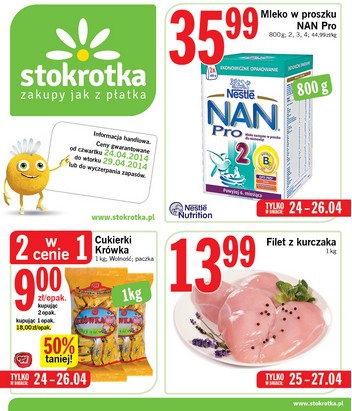 Nowa gazetka promocyjna sieci handlowej Stokrotka. Polecane promocje z gazetki Stokrotka: Mleko w proszku NAN Pro 800 g - 35,99 zł. Cukierki Krówka 2 kg - 18 zł. Filet z kurczaka 1 kg - 13,99 zł. Oferta…