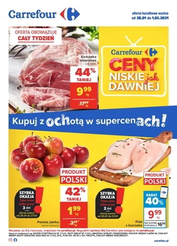 {loadposition linkCarrefour} 'Ceny niskie jak dawniej' - nowa gazetka promocyjna sieci marketów Carrefour. Polecane promocje z gazetki Carrefour: Karkówka wieprzowa bez kości 1 kg - 9,99 zł. Polskie jabłka 1 kg - 1,99 zł. Filet z łososia ze skórą…