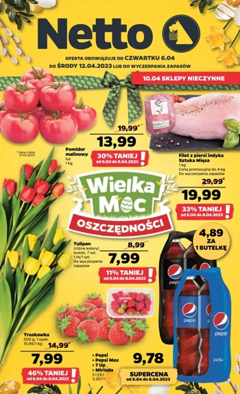 {loadposition linkNetto} 'Dyskontowe asy tygodnia' - nowa gazetka promocyjna sieci sklepów Netto. Polecane promocje z gazetki Netto: Bratki 10 sztuk - 8,99 zł*. Miód nektarowy wielokwiatowy Huzar 2,1 kg - 28,99 zł**. Filet z piersi indyka Sztuka Mięsa 1…