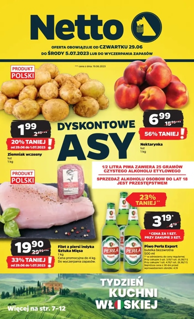 'Dyskontowe asy' - nowa gazetka promocyjna sieci sklepów Netto. Polecane promocje z gazetki Netto: Ziemniaki wczesne 1 kg - 1,99 zł*. Filet z piersi indyka Sztuka Mięsa 1 kg - 18,99 zł*. Brzoskwinie 1 kg - 4,99 zł. …
