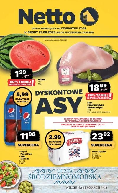 {loadposition linkNetto} 'Dyskontowe asy' - nowa gazetka promocyjna sieci sklepów Netto. Polecane promocje z gazetki Netto: Arbuz - 1,99 zł*. Filet z piersi indyka Sztuka Mięsa 1 kg - 18,99 zł**. Piwo Żywiec 8x500 ml - 23,92 zł. …