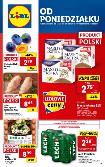 {loadposition linkLidl1} 'Od poniedziałku' - nowa gazetka promocyjna sieci sklepów Lidl. Polecane promocje z gazetki sklepów Lidl: Masło ekstra Polmlek 3x200 g - 8,25 zł. Polskie śliwki 1 kg - 2,79 zł. Filet z piersi kurczaka…