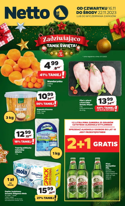 {loadposition linkNetto5} 'Zadziwiająco tanie święta!' - nowa gazetka promocyjna sieci sklepów Netto. Polecane promocje z gazetki Netto: Mandarynka siatka 1 kg - 4,99 zł. Filet z piersi kurczaka Sztuka Mięsa 1 kg - 13,99 zł*. Kapusta kiszona 3 kg…