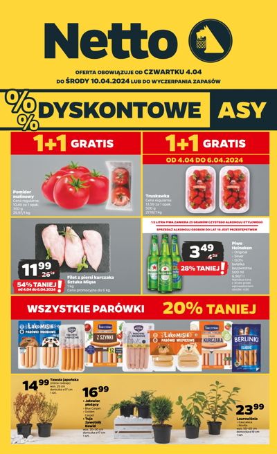 'Dyskontowe asy' - nowa gazetka promocyjna sieci sklepów Netto. Polecane promocje z gazetki Netto: Filet z piersi kurczaka Sztuka Mięsa 1 kg - 11,99 zł*. Piwo Heineken 500 ml - 3,49 zł. Tawuła japońska w doniczce - 14,99 zł.…