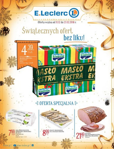 {loadposition linkEleclerc} 'Świątecznych ofert bez liku!' - nowa gazetka promocyjna sieci handlowej E.Leclerc. Polecane promocje z gazetki E.Leclerc: Masło Ekstra Krasnystaw 200 g - 4,39 zł. Jaja ekologiczne Kokoszka Ekolożka Czachowski klasa L 10 sztuk - 7,99 zł.…