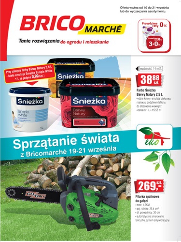 {loadposition linkBricomarche} Nowa gazetka promocyjna Bricomarche. Polecane promocje z gazetki Bricomarche: Farba Śnieżka Barwy Natury 2,5 L - 38,88 zł. Pilarka spalinowa do gałęzi - 269 zł. Firana Otylia wym. 140x160 cm - 14,99 zł. Oferta ważna od…