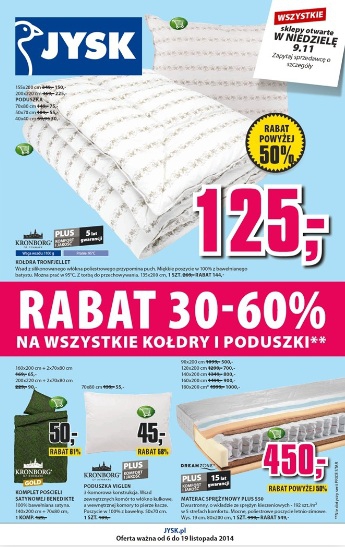 Nowa gazetka promocyjna JYSK. Polecane promocje z gazetki Jysk: Rabat 30-60% na wszystkie kołdry i poduszki. Rabat 25-50% na wszystkie firany. Rabat 30-60% na wszystkie materace. Oferta ważna od 6.11 do 19.11.