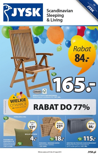 Nowa gazetka promocyjna JYSK. Polecane promocje z gazetki Jysk: Rabat 30-70% na wszystkie poduszki. Rabat 20-60% na wszystkie dekoracje do ogrodu. Rabat 20-40% na wszystkie firany. Oferta ważna od 14.05 do 27.05.