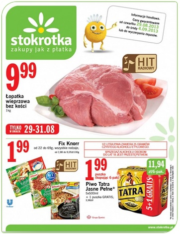 Nowa gazetka promocyjna sieci handlowej Stokrotka. Polecane promocje z gazetki Stokrotka: Łopatka wieprzowa bez kości 1 kg - 9,99 zł. Fix Knorr - 1,99 zł. Piwo Tatra Jasne Pełne 6x500 ml - 11,94 zł. Oferta ważna od…