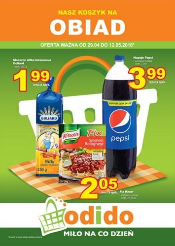 Nowa gazetka promocyjna sklepów Odido - "Nasz koszyk na obiad". Polecane promocje z gazetki Odido: Makaron nitka luksusowa Goliard 250 g - 1,99 zł. Pepsi 2,25 L - 3,99 zł. Fix Knorr - 2,05 zł. Oferta ważna…