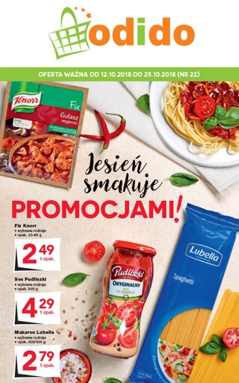 'Jesień smakuje promocjami!' - nowa gazetka promocyjna sklepów Odido. Polecane promocje z gazetki Odido: Fix Knorr wybrane rodzaje - 2,49 zł. Sos Pudliszki wybrane rodzaje 500 g - 4,29 zł. Makaron Lubella wybrane rodzaje - 2,79…