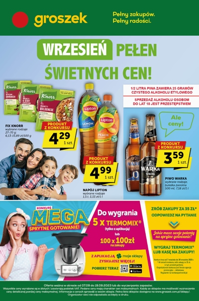 {loadposition linkGroszek} 'Wrzesień pełen świetnych cen!' - nowa gazetka promocyjna sieci sklepów Groszek. Polecane promocje z gazetki Groszek: Fix Knorr - 4,29 zł. Napój Lipton 1,5 L - 4,99 zł. Piwo Warka 500 ml - 3,59 zł. …