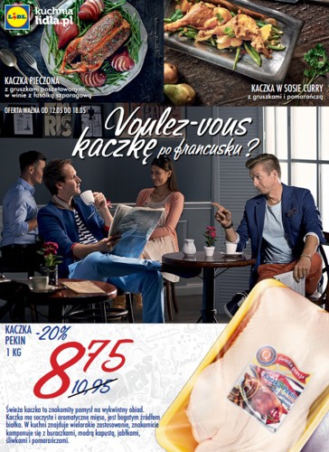 {loadposition linkLidl} Nowa gazetka promocyjna Lidl - "Voulez-vous kaczkę po francusku?". Polecane promocje z gazetki Lidl: Kaczka Pekin 1 kg - 8,75 zł. Palma kokosowa - 29,99 zł. Grill stołowy SilverCrest 1800 W - 149 zł. Akcje promocyjne…
