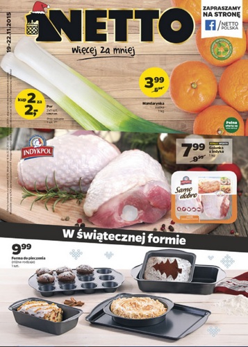 {loadposition linkNetto} Nowa gazetka promocyjna Netto - "W świątecznej formie". Polecane promocje z gazetki Netto: Forma do pieczenia - 9,99 zł. Golonka z indyka - 7,99 zł. Mandarynki 1 kg - 3,99 zł. Oferta ważna od 19.11…