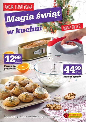 {loadposition linkBiedronka} Nowa gazetka promocyjna sieci handlowej Biedronka - "Magia świąt w kuchni". Polecane promocje z gazetki sieci Biedronka: Mikser ręczny - 44,99 zł. Forma do pieczenia - 12,99 zł. Blender ręczny Hoffen Food Expert 700 W - 99,90…
