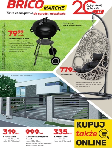 {loadposition linkBricomarche} Nowa gazetka promocyjna sieci sklepów Bricomarche. Polecane promocje z gazetki Bricomarche: Grill kulisty - 79,99 zł. Fotel wiszący - 779 zł. Brama dwuskrzydłowa Daniel - 999 zł. Oferta ważna od środy 8.04 do soboty 18.04…