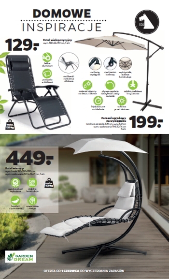 'Domowe inspiracje' - nowa gazetka promocyjna sieci sklepów Netto. Polecane promocje z gazetki Netto: Fotel wielopozycyjny - 129 zł. Parasol ogrodowy na wysięgniku - 199 zł. Fotel wiszący - 449 zł. Oferta ważna od poniedziałku 1.06…