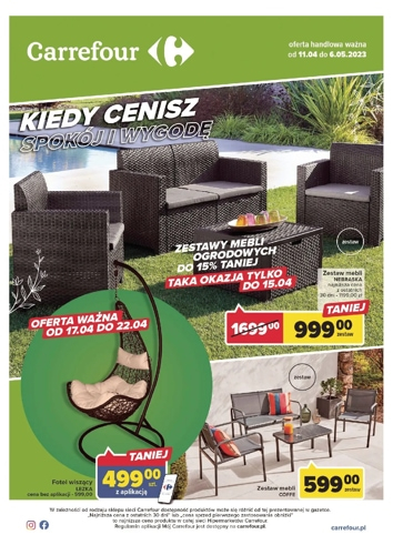 {loadposition linkCarrefour6} 'Kiedy cenisz spokój i wygodę' - nowa gazetka promocyjna sieci marketów Carrefour. Polecane promocje z gazetki Carrefour: Zestaw mebli ogrodowych Nebraska - 999 zł. Fotel wiszący Łezka - 499 zł*. Zestaw mebli Coffe - 599 zł. …