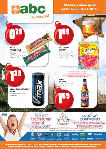 Nowa gazetka promocyjna sklepów ABC. Polecane promocje z gazetki ABC: Wafel Prince Polo 35 g - 0,79 zł. Galaretka Winiary 75 g - 1,09 zł. Napój energetyczny V-Max 250 ml - 1,39 zł. Oferta ważna od 10.12…