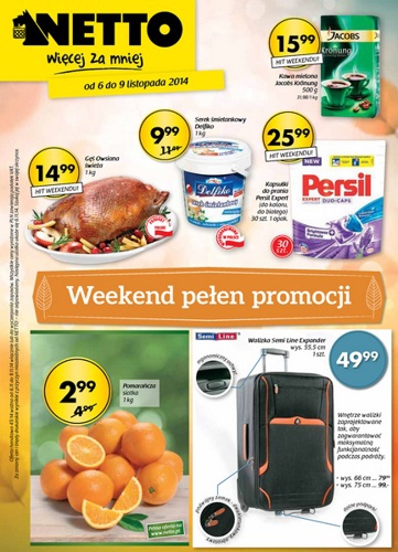 {loadposition linkNetto} Nowa gazetka promocyjna Netto - "Weekend pełen promocji". Polecane promocje z gazetki Netto: Pomarańcze 1 kg - 2,99 zł. Walizka Semi Line Expander - 49,99 zł. Gęś owsiana świeża 1 kg - 14,99 zł. Oferta…