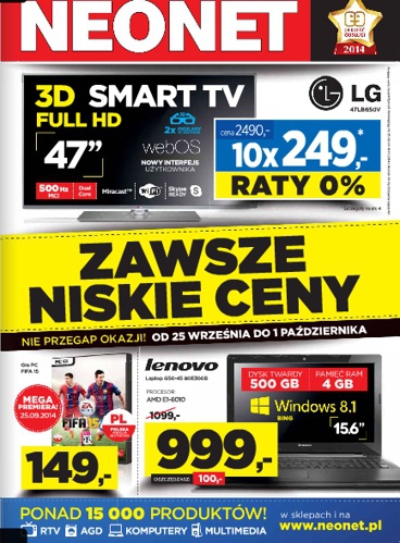 {loadposition linkNeonet} Nowa gazetka promocyjna Neonet - "Zawsze niskie ceny". Polecane promocje z gazetki Neonet: Telewizor LED 3D 47" LG 47LB5650V - 2490 zł. Laptop Lenovo G50-45 80E300B - 999 zł. Gra PC FIFA 15 - 149 zł. …