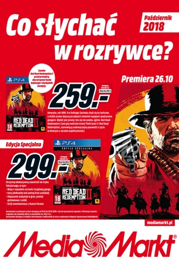 {loadposition linkMediaMarkt} 'Co słychać w rozrywce?' - październikowe wydanie gazetki promocyjnej Media Markt. Polecane promocje z gazetki Media Markt: Gra PS4 Red Dead Redemption 2 - 259 zł. Gra PC Assassin’s Creed Odyssey - 199 zł. Gra PS4…