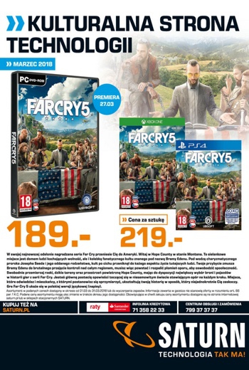 {loadposition linkMediaMarkt} 'Kultruralna strona technologii' - marcowe wydanie gazetki promocyjnej Saturn. Polecane promocje z gazetki Saturn: Gra PC Far Cry 5 - 189 zł. Gra PS4 Bravo Team - 139 zł. Gra PS4 Frantics - 69,90 zł. …