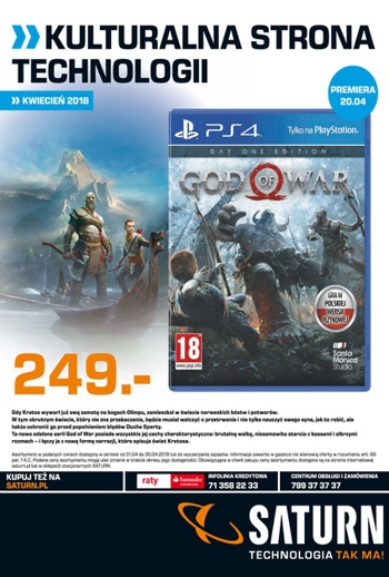 {loadposition linkMediaMarkt} 'Kultruralna strona technologii' - kwietniowe wydanie gazetki promocyjnej Saturn. Polecane promocje z gazetki Saturn: Gra PS4 God of War - 249 zł. Gra PS4 Frantics - 69,90 zł. Gra PC Farm Manager 2018 - 59,90 zł. …