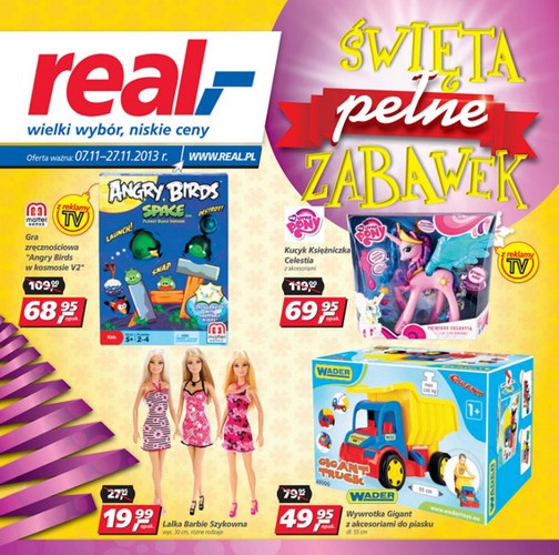 Nowa gazetka promocyjna sieci handlowej Real - "Święta pełne zabawek". Polecane promocje z gazetki Real: Kucyk księżniczka Celestia - 69,95 zł. Lalka Barbie - 19,99 zł. Gra zręcznościowa Angry Birds w kosmosie V2- 68,95 zł. Oferta ważna…