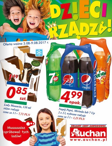 {loadposition linkAuchan} Nowa gazetka promocyjna Auchan - "Dzieci rządzą". Polecane promocje z gazetki Auchan: Lody Muuucia 110 ml - 0,85 zł. Pepsi, Mirinda lub 7Up 2x2 L - 4,99 zł. Gra zręcznościowa Mistakos - 32,99 zł. Zakupy…