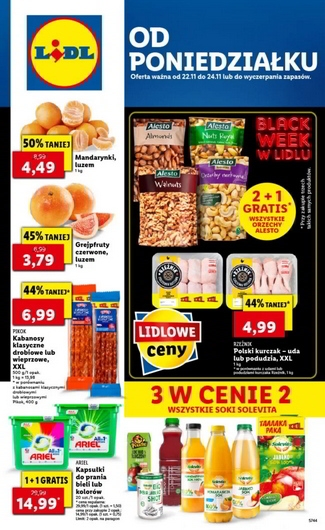 {loadposition linkLidl1} 'Od poniedziałku Black Week' - nowa gazetka promocyjna sieci sklepów Lidl. Polecane promocje z gazetki sklepów Lidl: Mandarynki 1 kg - 4,49 zł. Grejpfruty czerwone 1 kg - 3,79 zł. Kabanosy klasyczne Pikok 500 g - 6,99…