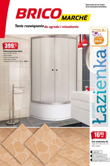 {loadposition linkBricomarche} Nowa gazetka promocyjna Bricomarche - "Projekt łazienka". Polecane promocje z gazetki Bricomarche: Kabina prysznicowa Saturn - 399 zł. Gres strukturalny Rio m² - 16,85 zł. Bateria umywalkowa Lapi - 27,49 zł. Oferta ważna od 2.07 do…